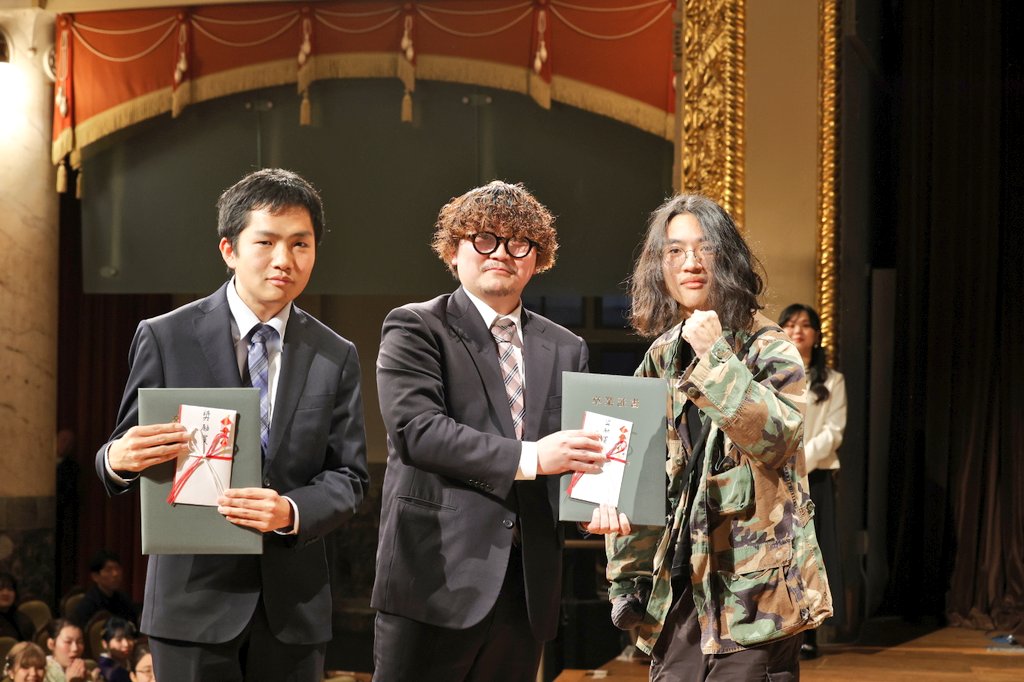壇上にあげられるとは思わず、まさかの私服登壇。登壇者皆ドン引き。なお、左から顔面ハプニング’sより喜多、コブトリ。席から「戦場カメラマン」とヤジが飛ぶ。